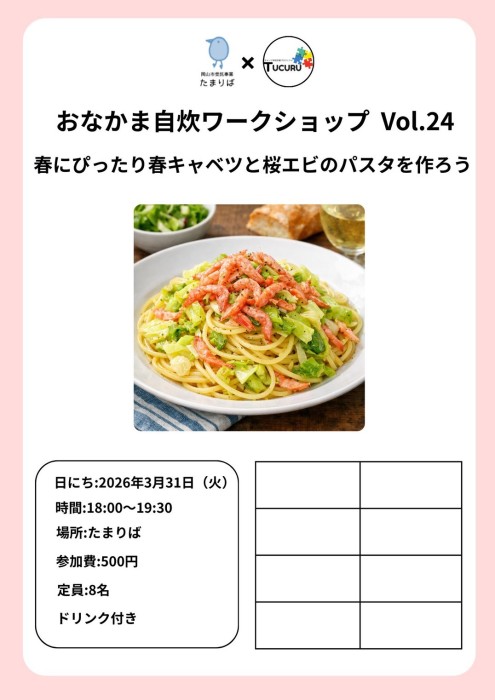 おなかま自炊ワークショップ 春にぴったり春キャベツと桜エビのパスタを作ろう